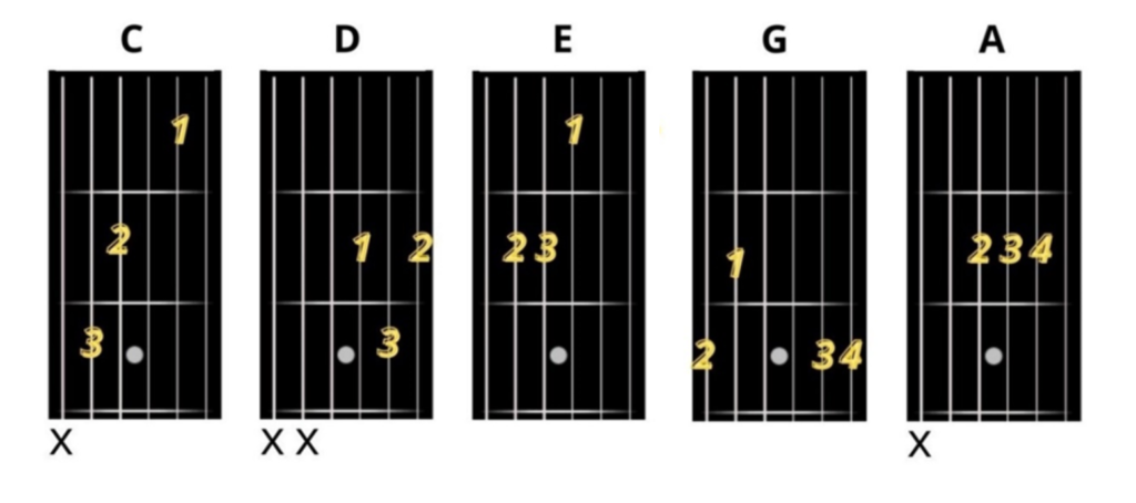 Pratique esse desenho subindo e descendo, focando na clareza do som de cada nota. Ela tem uma sonoridade “feliz” e aberta. Comece pelas notas ”C,D e E” da corda ”A”; ”F,G e A” da corda ”D” e a nota ”B” da corda ”G”para soar como no áudio.