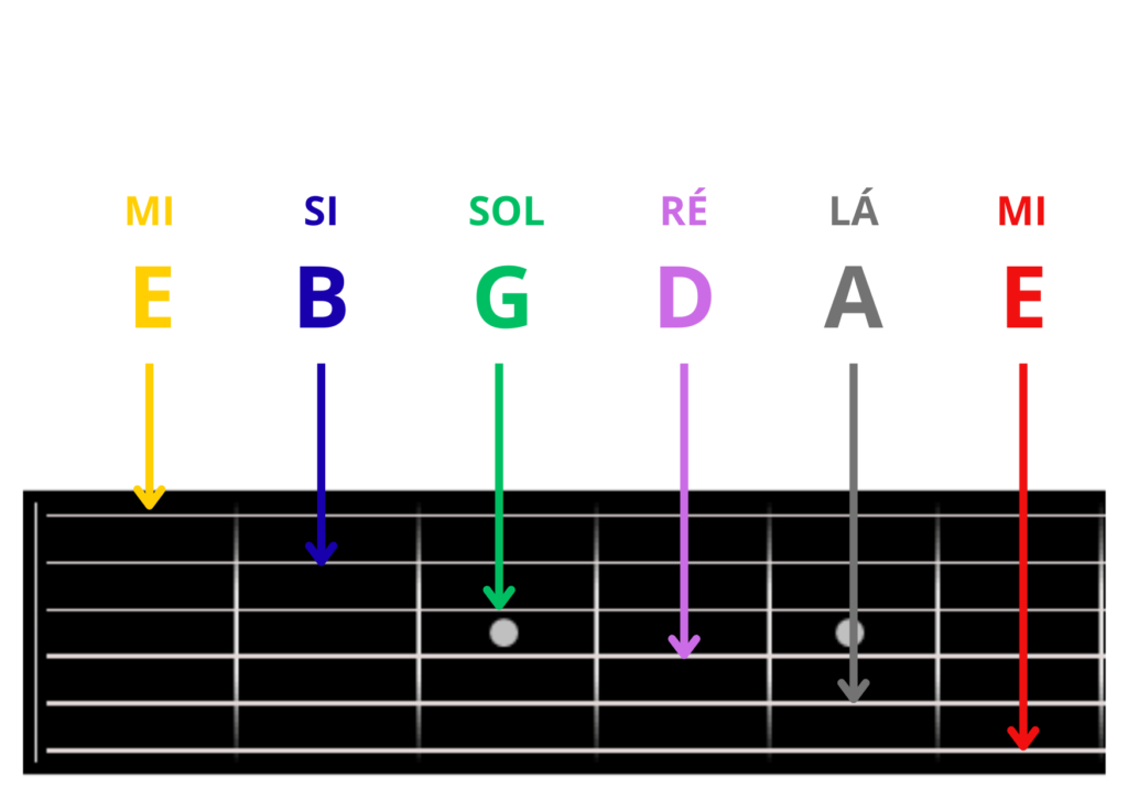 A guitarra possui seis cordas, cada uma com um nome e uma nota específica quando tocada solta (sem nenhum dedo pressionando). Elas são contadas de baixo para cima (da mais fina para a mais grossa):