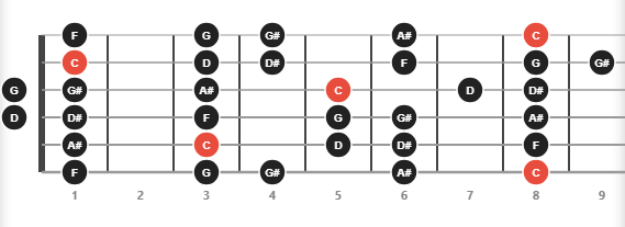 Notas: Dó (C) – Ré (D) – Mib (Eb) – Fá (F) – Sol (G) – Láb (Ab) – Sib (Bb)