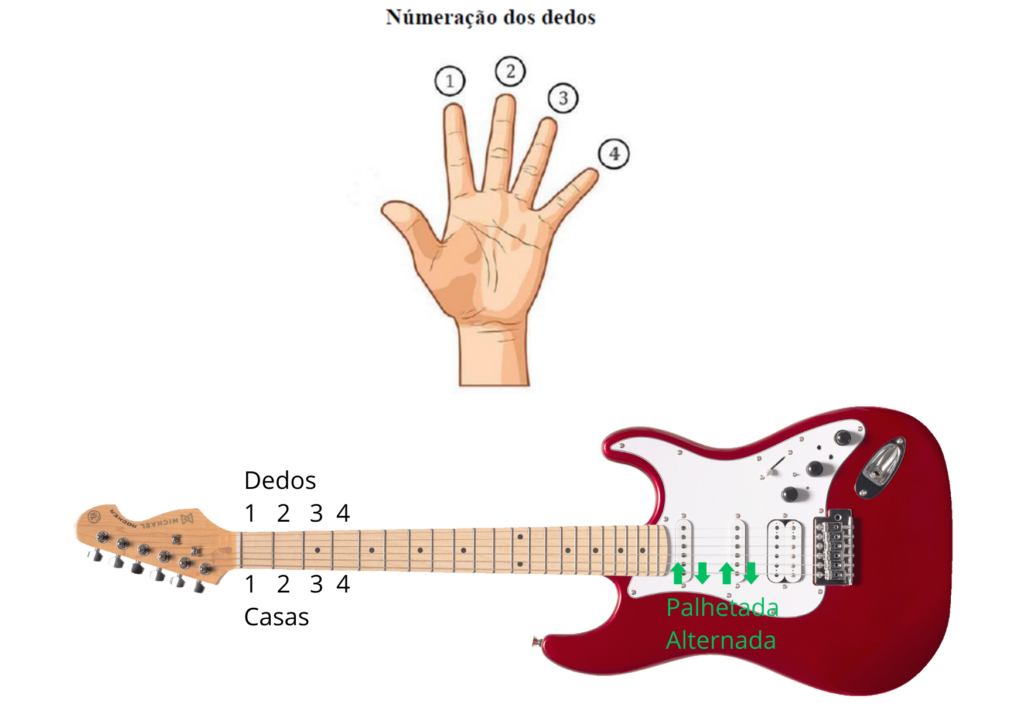 Veja na figura abaixo os números das casas, os números dos dedos e o sentido da palhetada: